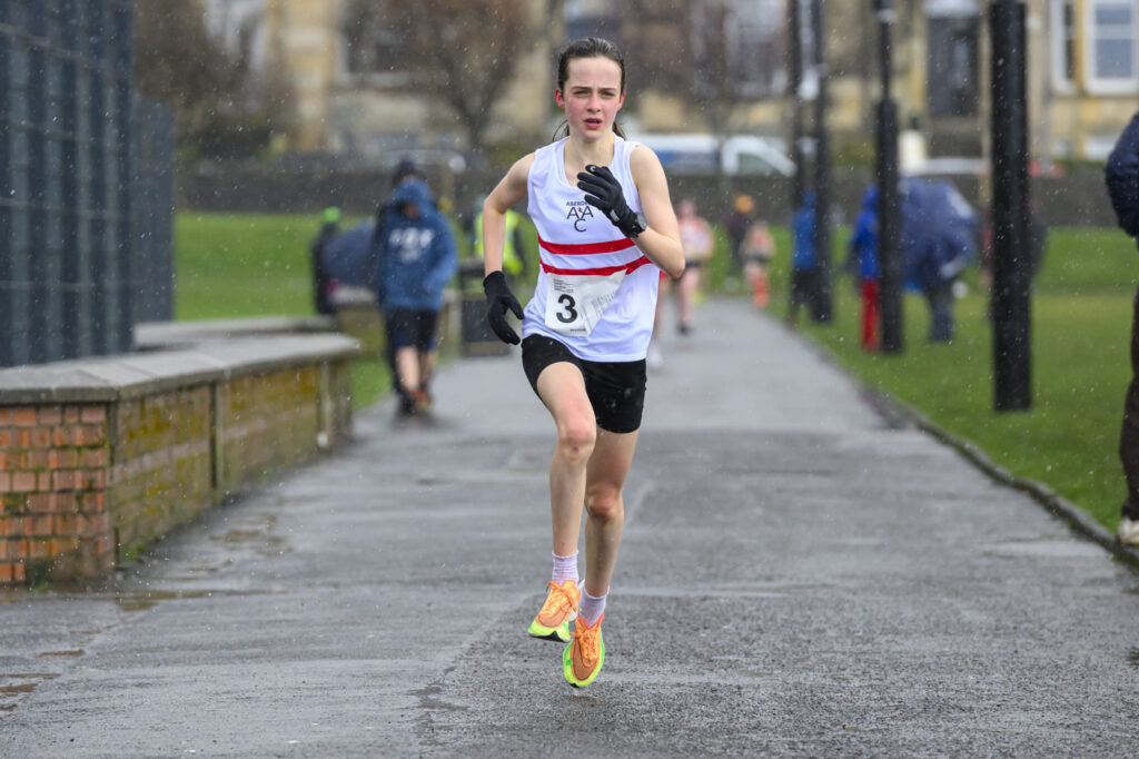 Aberdeen athlete Millie Glass-Park defied the conditions to win gold in that opening U13 Girls race to win by a large margin. Silver went to Abbie Boyle of Law and District with third-place claimed by Isobel Patterson of Harmeny AC.