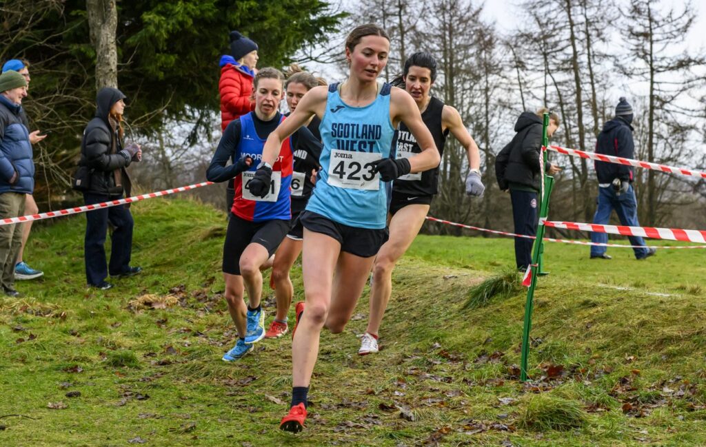 Naomi on way to Scottish Inter-District XC victory in January 2026 (photo by Bobby Gavin)