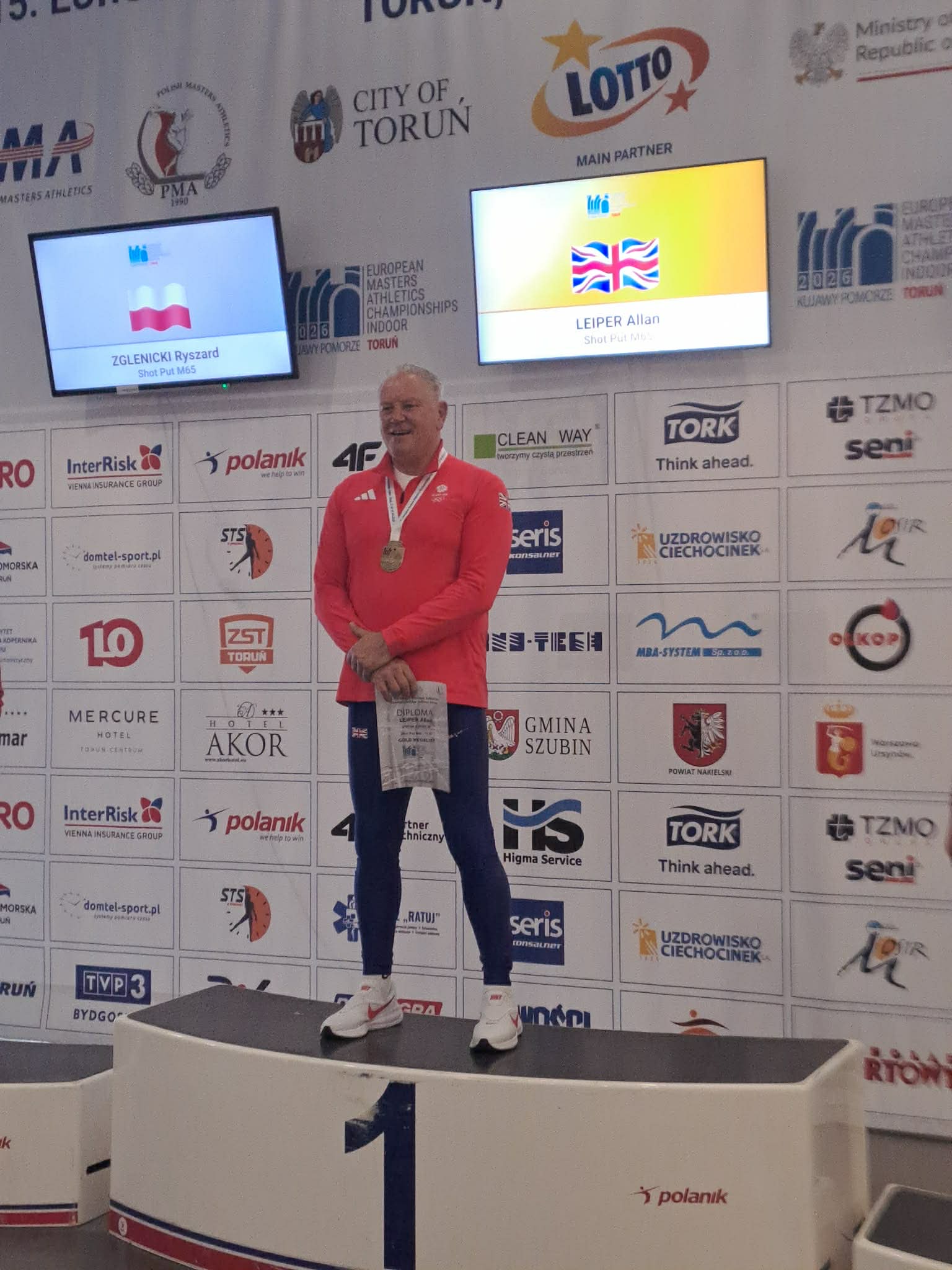Allan Leiper – M65 indoor shot British record. Although he achieved an even bigger throw earlier in the year at Lee Valley this has yet to be ratified, but he also broke the old mark this week in Torun (13.77m).